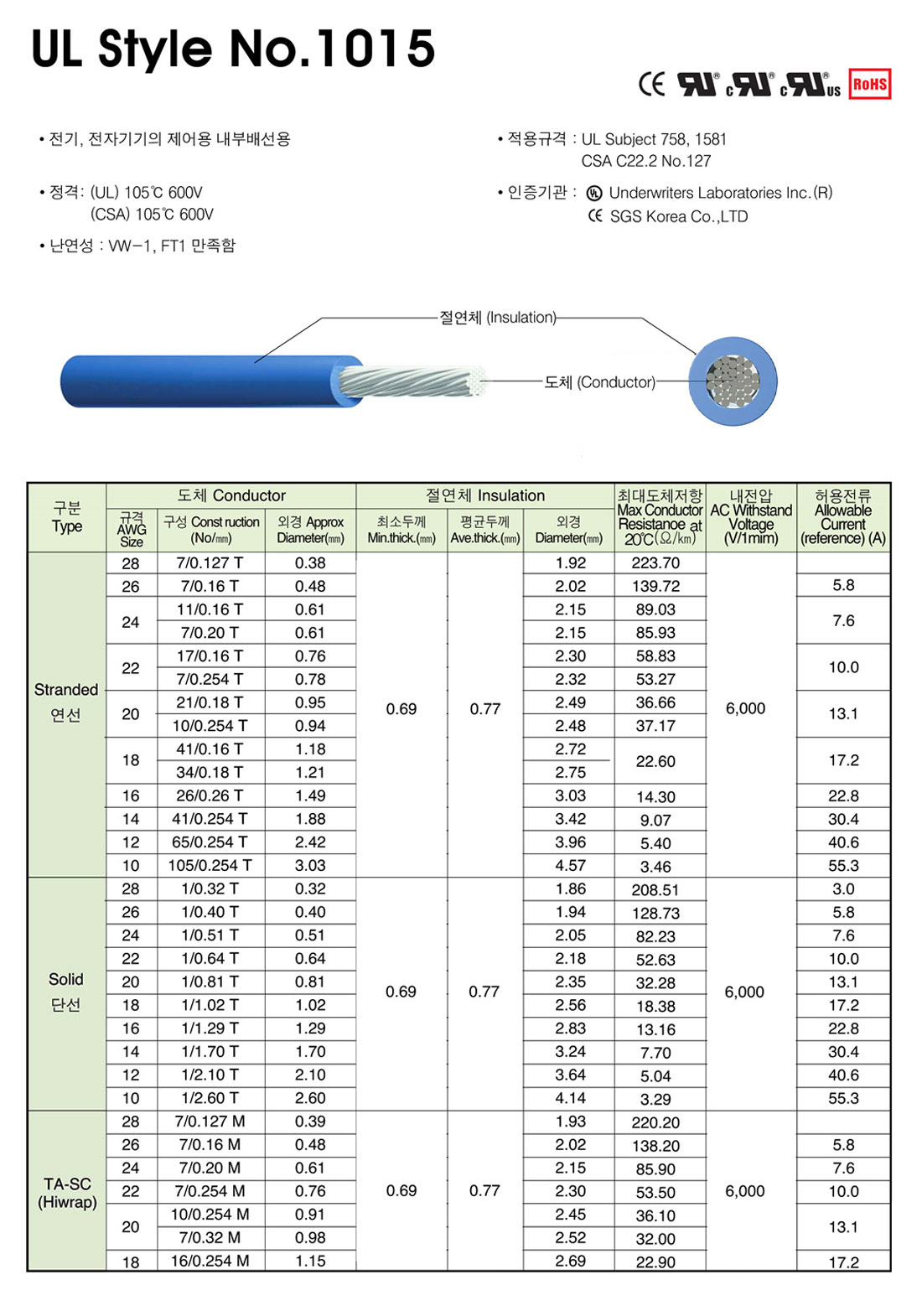 - 300V UL Style 전선, 600V UL Style 전선 - UL 1007, UL1015